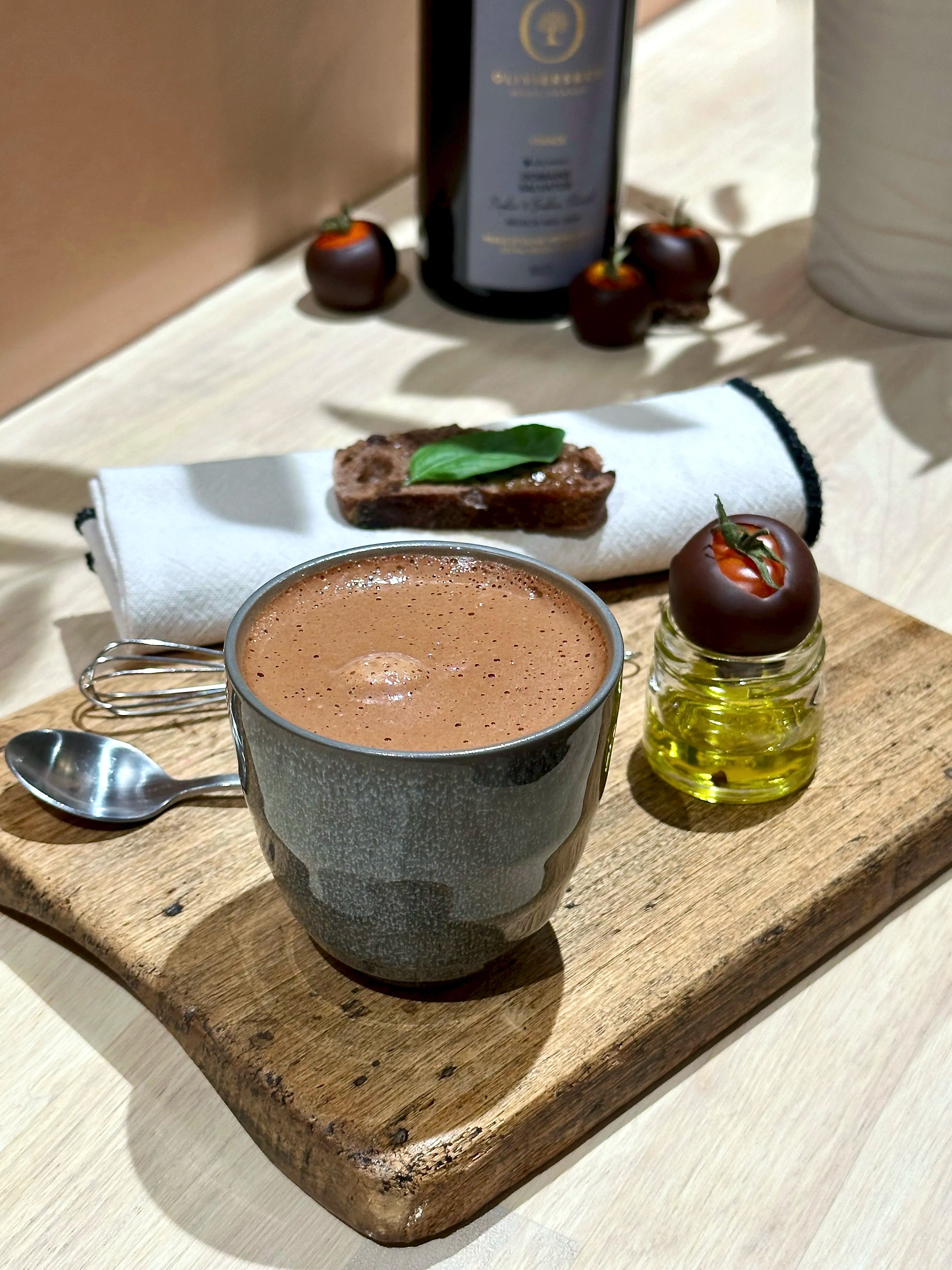 La Pause Gourmet, c'est l'association du chocolate Santafereño, le petit-déjeuner traditionnel Colombien, et des incontournables tomate/mozza et bruschetta appréciées sur les tables l'été, le reflet de la fraîcheur Italienne. :