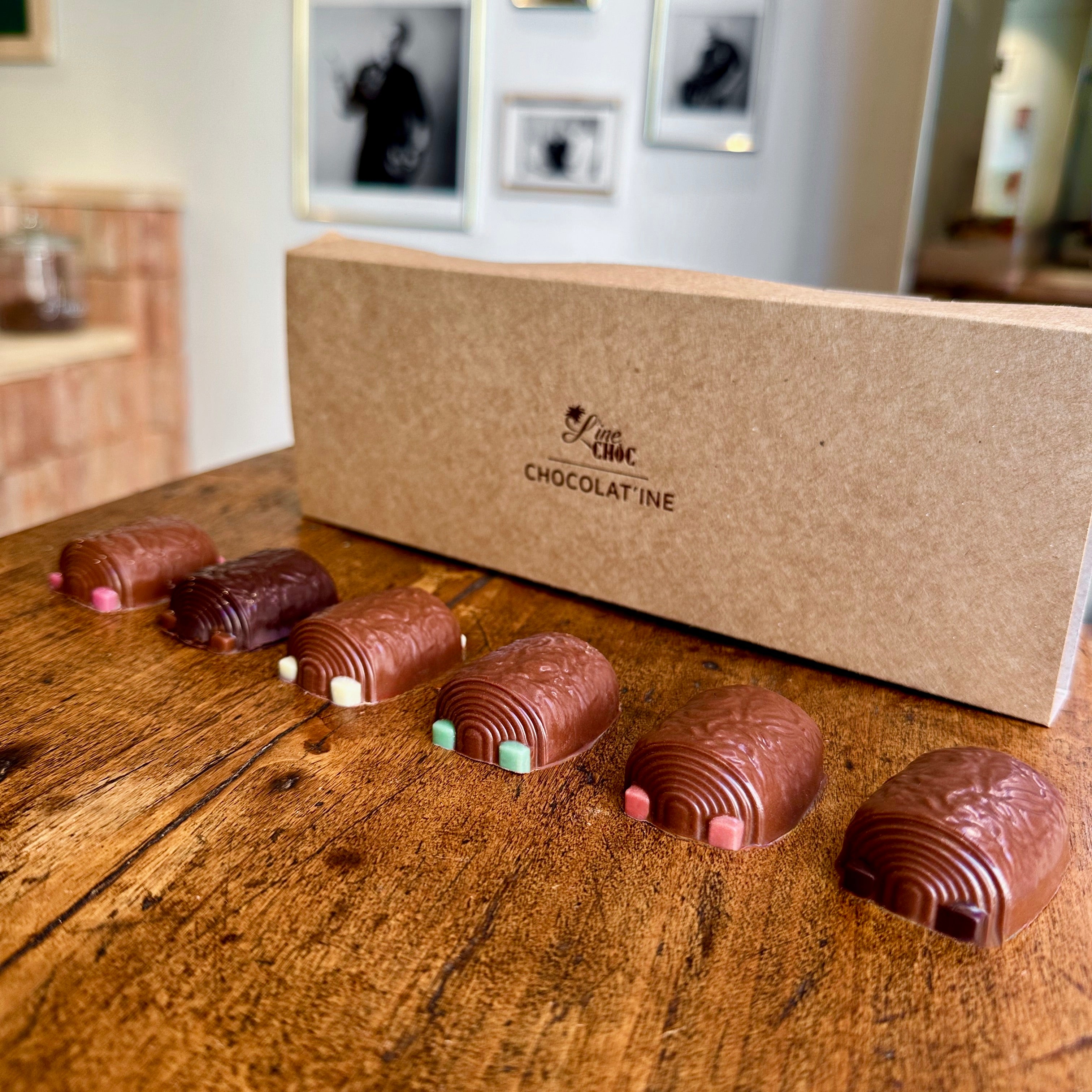 Ma création signature en hommage à ma ville d'adoption, Toulouse. Découvrez les saveurs originales d'un chocolat gourmand reprenant l'emblématique forme de la chocolatine.
