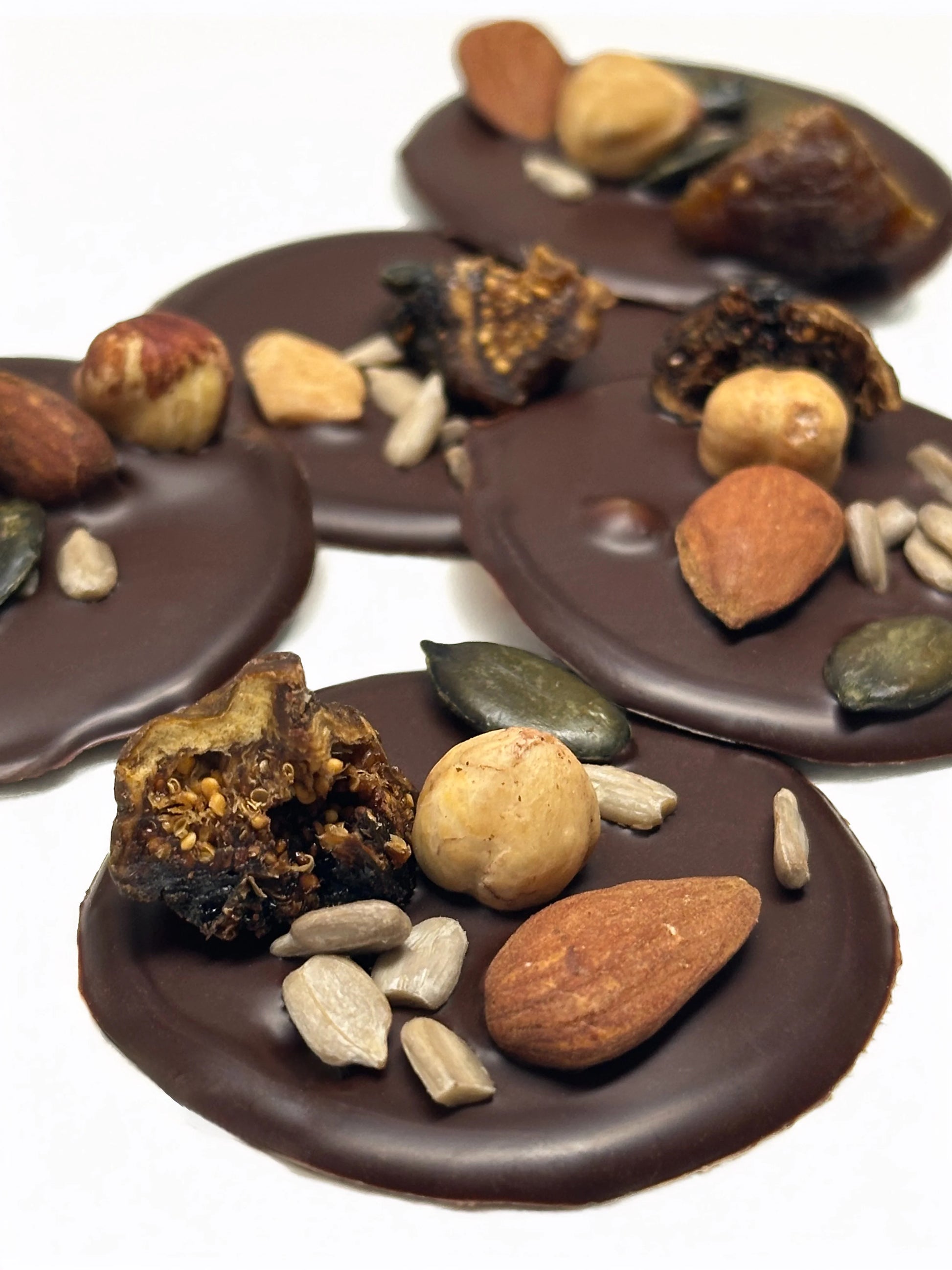 5 palets de chocolat noir Bio 70% de Madagascar, des fruits et fruits secs torréfiés Bio du Lot-et-Garonne et des pétales de fleurs comestibles Bio d'Occitanie.